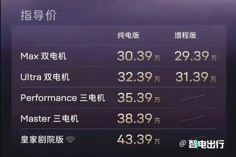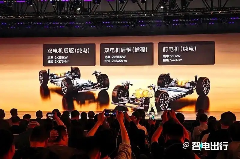 新车提供增程、纯电双动力版本。增程版CLTC综合续航1270km;纯电版最高续航735km,支持6C超充,纯电版相比增程版多了一个三电机四驱版,0-100km/h加速最快2.71秒,加速性能非常强。