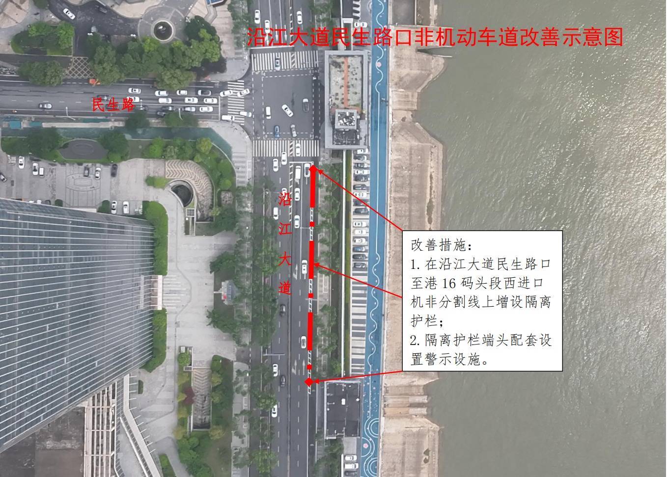 针对该民生交通问题,武汉江汉交警第一时间开展现场踏勘,结合路口道路条件制定专项优化改造方案。本次优化具体实施两项改造措施:1是在沿江大道民生路口至港16码头段西进口机非分割线上增设隔离护栏;2是隔离护栏端头配套设置警示设施。
